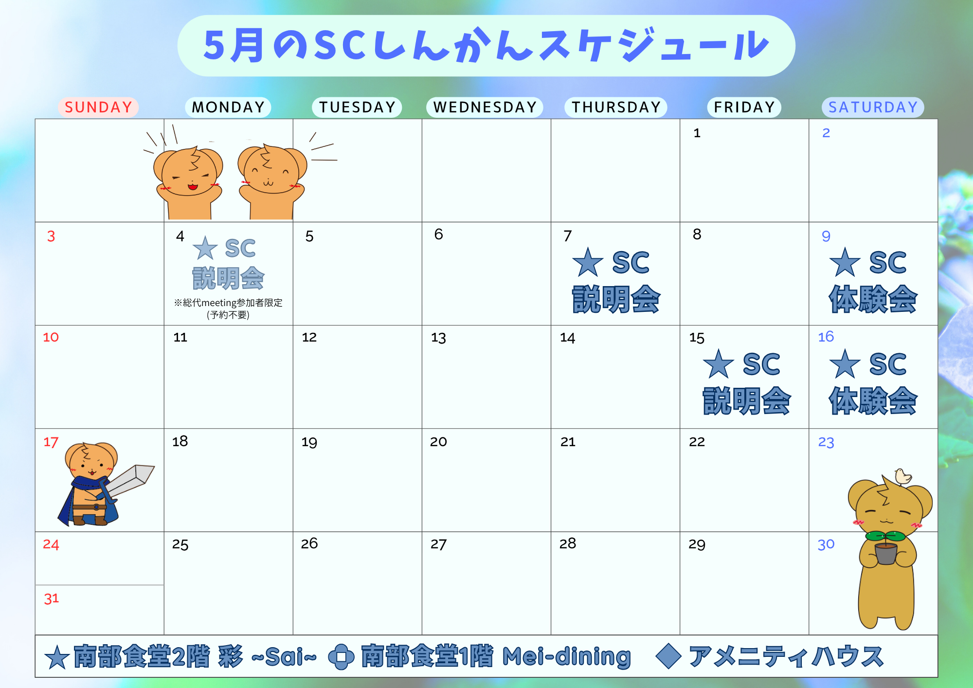 | 場所 | カレンダー参照(南部食堂 または、 アメニティハウス1階) |